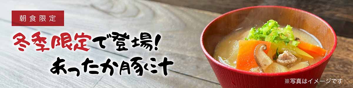 寒い時期も朝のあったか豚汁で体を温め、元気に過ごしていただきたい…。そんな思いで、栄養たっぷり、ほっこり具だくさんの豚汁をご用意しております。